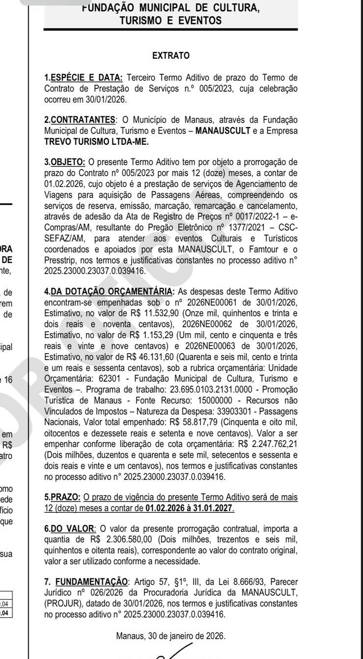 A Prefeitura de Manaus, por meio da Fundação Municipal de Cultura, Turismo e Eventos (Manauscult), prorrogou por mais 12 meses o contrato com a empresa Trevo Turismo Ltda-ME para prestação de serviços de agenciamento de viagens e emissão de passagens aéreas destinadas a eventos culturais e turísticos promovidos pelo município. A prorrogação tem vigência de 1º de fevereiro de 2026 a 31 de janeiro de 2027. O extrato foi publicado no Diário Municipal de Manaus (DOM) desta sexta-feira, 13.