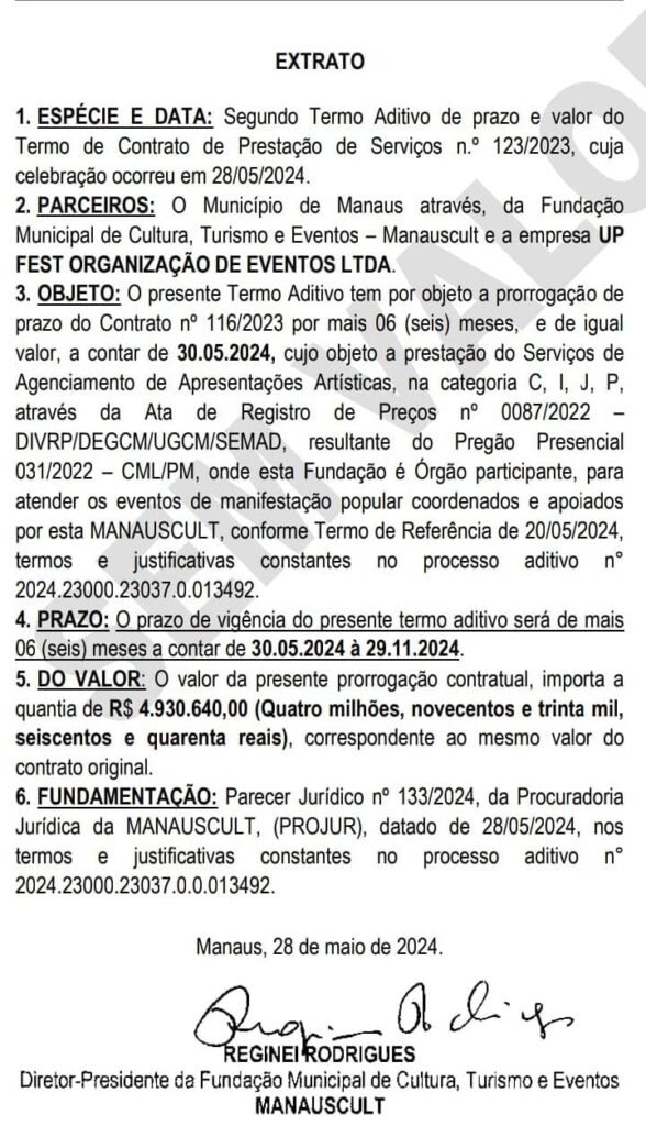 A prefeitura de Manaus, por meio da Fundação Municipal de Cultura, Turismo e Eventos (Manauscult), renovou um contrato pelo valor de R$ 4,9 milhões com empresa que agencia apresentações artísticas. O extrato foi divulgado no Diário Oficial do Município (DOM) da quinta-feira (13).