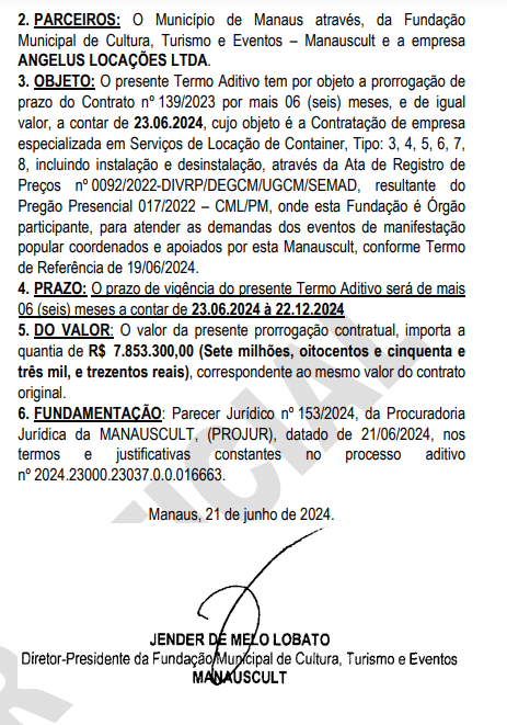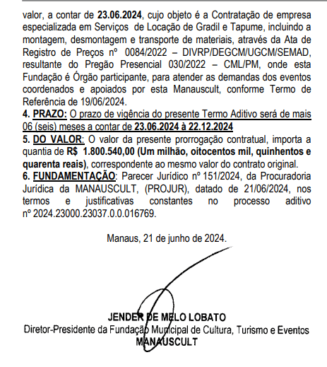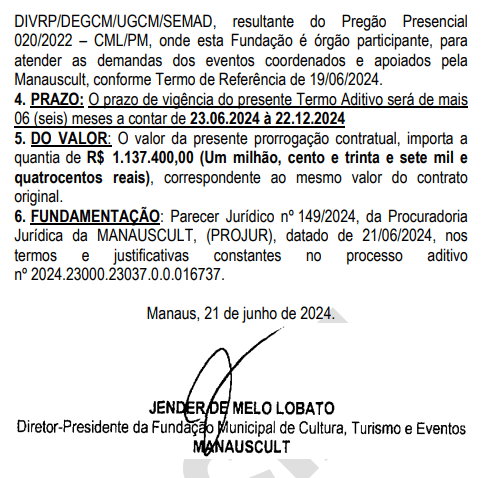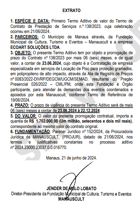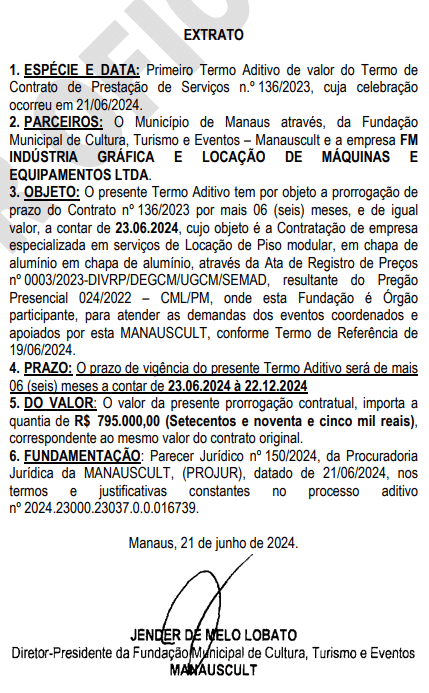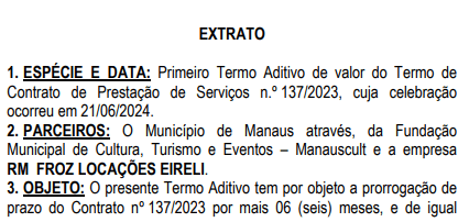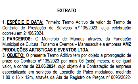 A prefeitura de Manaus, por meio da Fundação Municipal de Cultura, Turismo e Eventos (Manauscult), renovou cinco contratos que somam R$ 13,2 milhões com diversas empresas para prestação de serviços que vão de locação de palco à proteção de gramado. Os extratos foram publicados no Diário Oficial do Município (DOM) da quarta-feira (3).