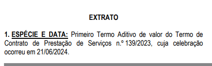De acordo com os extratos as empresas são AMZ Produções Artísticas e Eventos Ltda (contrato n.º 135/2023); FM Indústria Gráfica e Locação de Máquinas e Equipamentos Ltda (contrato nº. 136/2023); RM Froz Locações Eireli (contrato nº. 137/2023); Ecoart Soluções Ltda (contrato n°. 138/2023); e Angelus Locações Ltda (contrato nº. 138/2023).