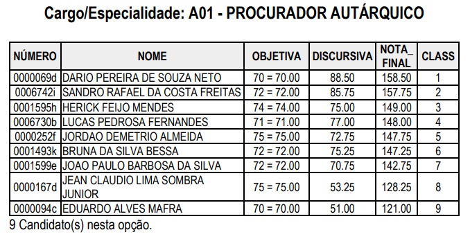 A Prefeitura de Manaus, via Manaus Previdência, divulgou o resultado final do concurso para o cargo de Procurador Autárquico (edital n° 01/2021), organizado pela Fundação Carlos Chagas (FCC). A classificação final é composta por nove candidatos no total. O edital foi publicado no caderno 1, da edição n° 5.364, do Diário Oficial do Município (DOM) da última terça-feira (14/06). O edital apresenta uma vaga para o cargo, ou seja, para o primeiro colocado da lista, além de cadastro reserva se houver vacância no setor durante a validade do concurso.