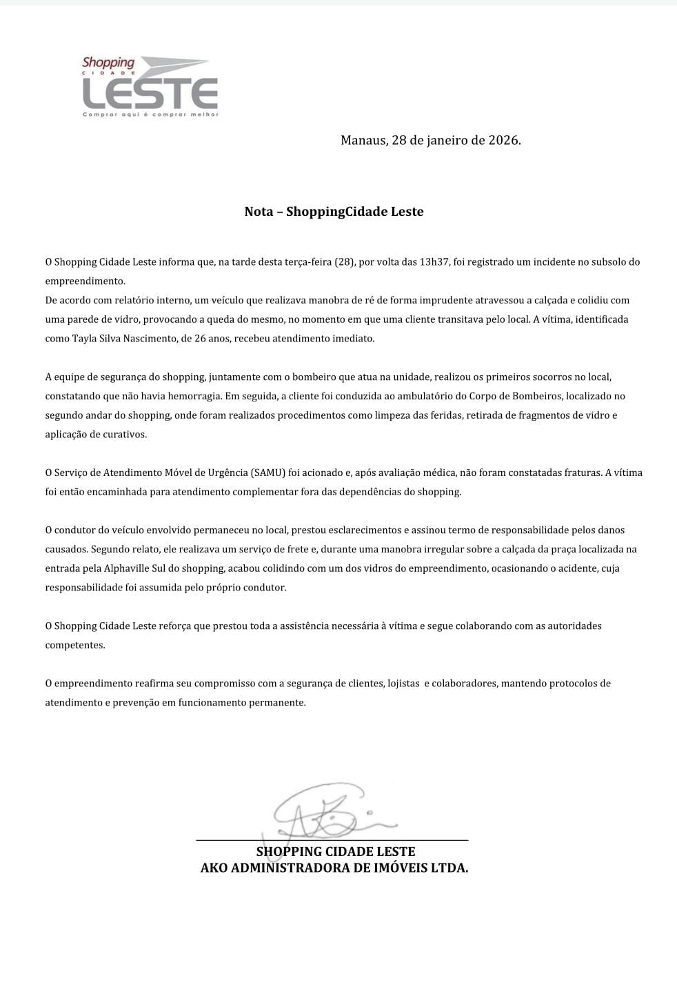 De acordo com nota oficial emitida pela administração do shopping, o condutor que realizava um serviço de frete executou uma manobra de ré considerada imprudente. O veículo atravessou a calçada da praça localizada na entrada pela Alphaville Sul e colidiu com uma parede de vidro, provocando a queda da estrutura no momento em que a cliente transitava pelo local.