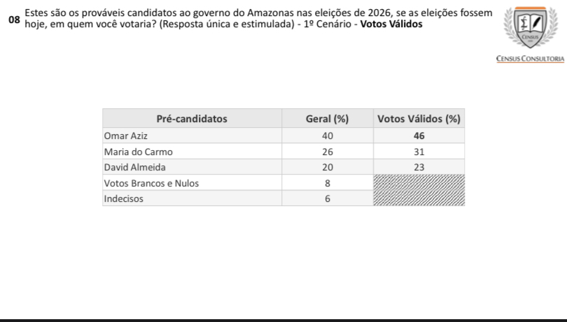 A nova pesquisa da Census Consultoria mostra que a Professora Maria do Carmo (PL) alcançou 30% das intenções de voto em Manaus, ultrapassando o prefeito David Almeida (Avante), que tem 19%, e encostando no senador Omar Aziz (PSD), com 32%, enquanto David lidera a rejeição com 63% de desaprovação.