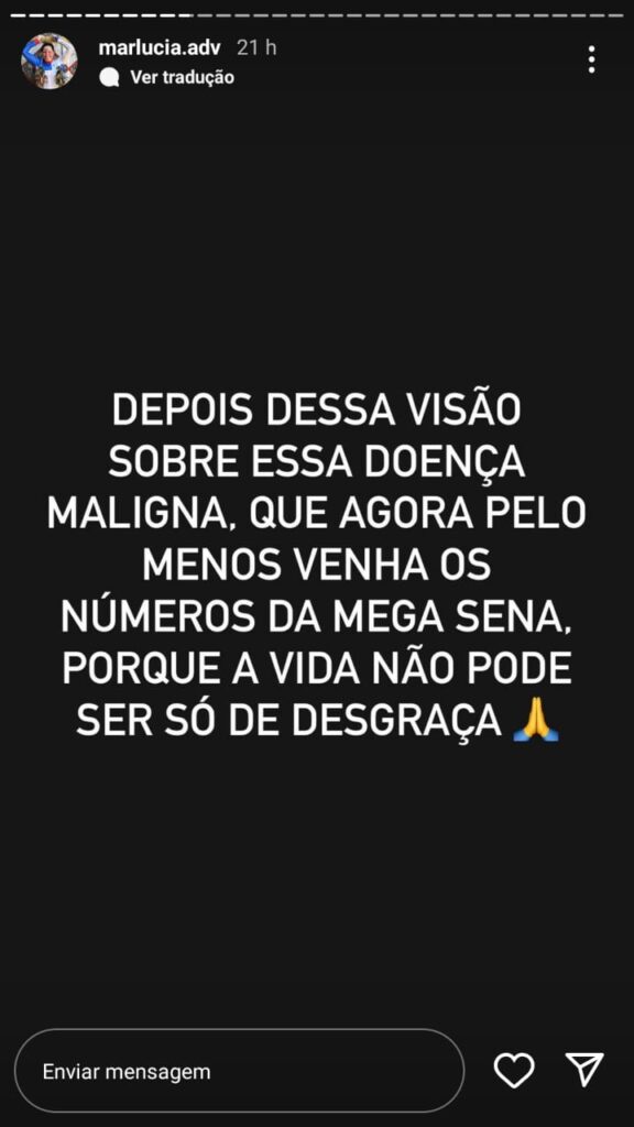 “Depois dessa visão sobre essa doença maligna, que agora pelo menos venha os números da Mega-Sena, porque a vida não pode ser só desgraça”, escreveu a advogada em seus stories