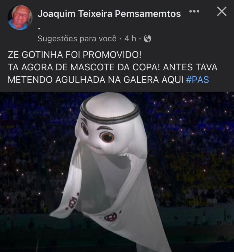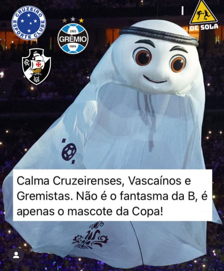 O mascote da Copa do Mundo do Qatar, La’eeb, se tornou meme nas redes sociais após a aparição na cerimônia de abertura do evento neste domingo (20). Ele chegou a ser comparado com o fantasma garpazinho e o fanstasma da série B, que “aterrorizou” torcedores nos estádios do Brasil.