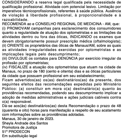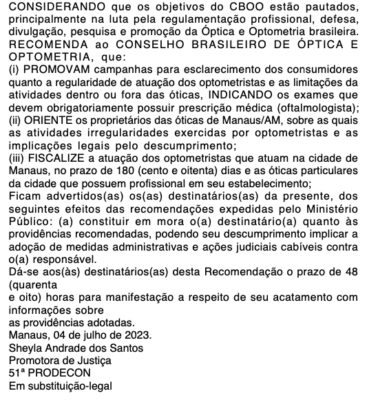 Também foi recomendado uma orientação aos donos das óticas de Manaus sobre quais as atividades irregularidades exercidas por optometristas e as implicações legais pelo descumprimento; divulguem os contatos para denúncias por exercício irregular da profissão por optometristas e fiscalizem a atuação dos optometristas e as óticas particulares da cidade que possuem profissional em seu estabelecimento, no prazo de 180 dias.