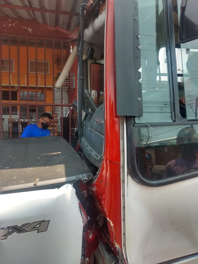 Um caminhão-baú colidiu com um ônibus do transporte coletivo na manhã desta terça-feira, dia 08, por volta das 11h30.