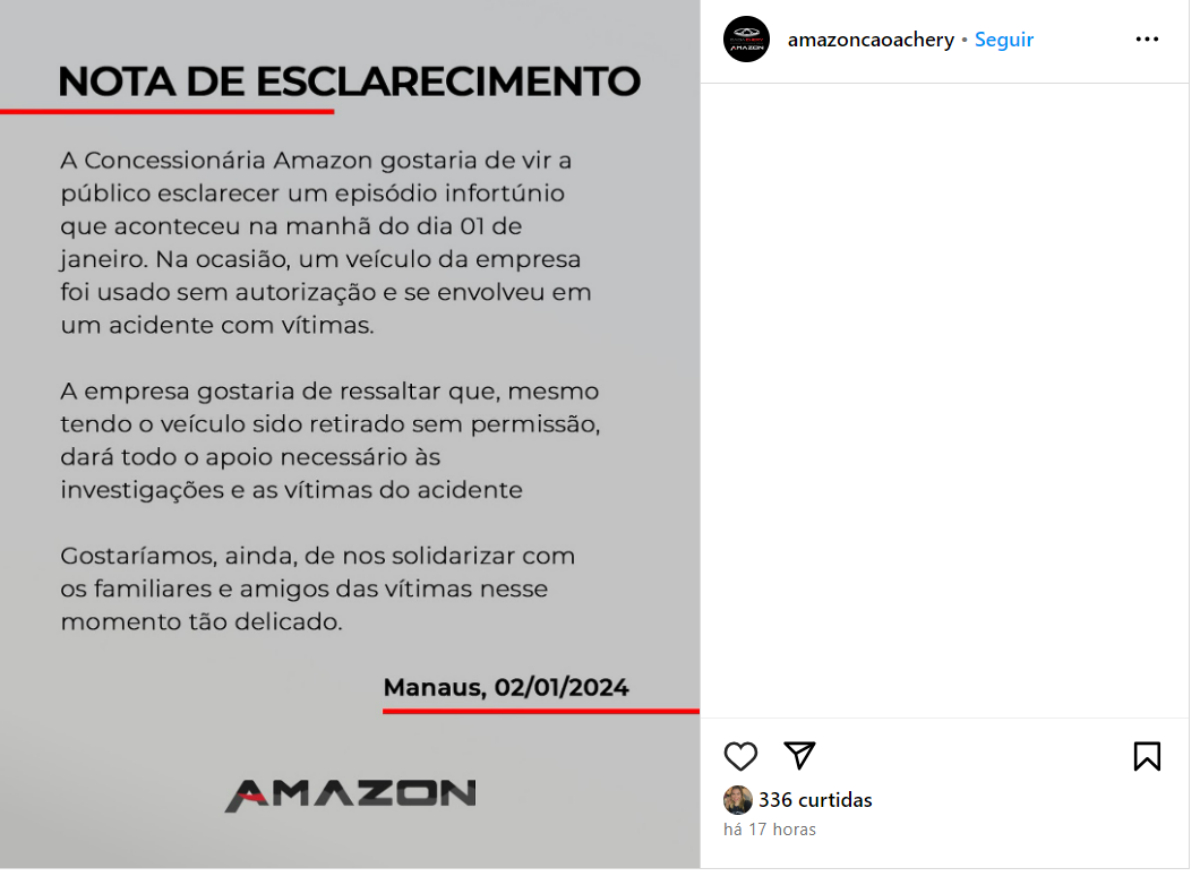 “A Concessionária Amazon gostaria de vir a público esclarecer um episódio infortúnio que aconteceu na manhã do dia 1° de janeiro. Na ocasião, um veículo da empresa foi usado sem autorização e se envolveu em um acidente com vítimas. A empresa gostaria de ressaltar que, mesmo tendo o veículo sido retirado sem permissão, dará todo o apoio necessário às investigações e às vítimas do acidente. Gostaríamos, ainda, de nos solidarizar com os familiares e amigos das vítimas nesse momento tão delicado”, diz a nota.