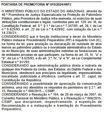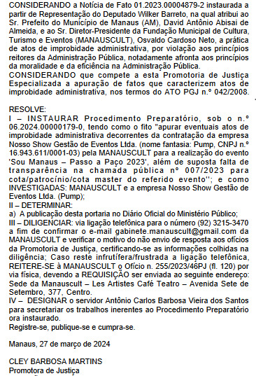 O MP-AM está investigando a suposta falta de transparência na chamada pública nº 007/2023 para cota/patrocínio do evento, com foco na Fundação Municipal de Cultura, Turismo e Eventos (Manauscult) e na empresa Pump. A promotora Cley Martins assinou o despacho de instauração do procedimento, baseando-se na representação do deputado estadual, Wilker Barreto (Cidadania) que acusa David Almeida e o ex-diretor-presidente da Manauscult, Osvaldo Cardoso Neto, de praticarem atos de improbidade administrativa.