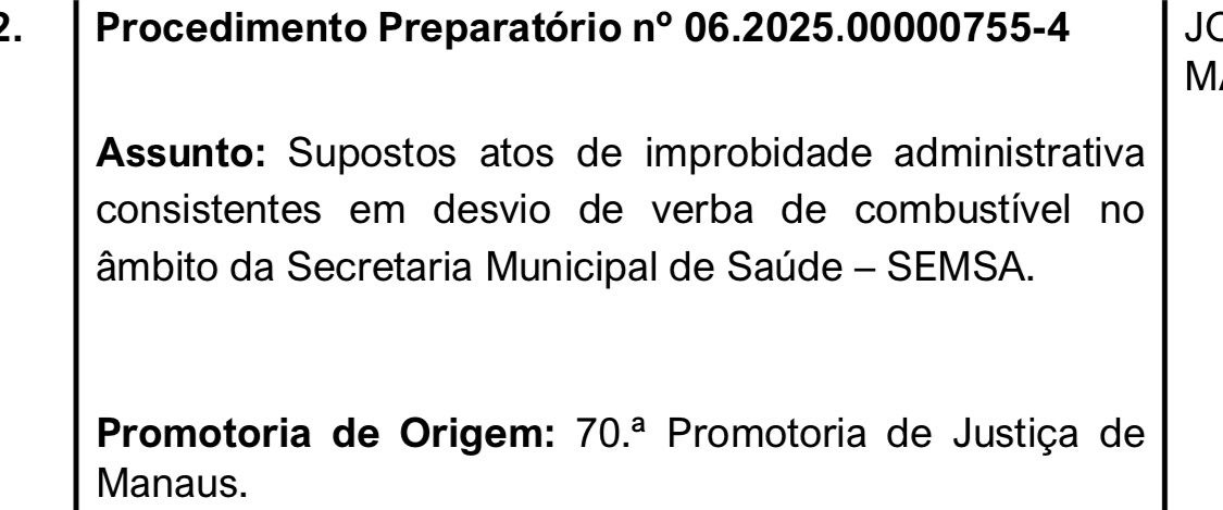Entre os casos que constam na pauta está o Procedimento Preparatório nº 06.2025.00000755-4, que apura supostos atos de improbidade administrativa relacionados ao desvio de recursos públicos destinados à compra de combustíveis.