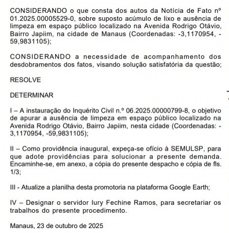 Conforme o documento, os inquéritos têm como objetivo verificar o acúmulo de lixo e a ausência de limpeza regular nesses locais, após denúncias encaminhadas à Promotoria. Um dos procedimentos, o Inquérito Civil nº 06.2025.00000799-8, foi instaurado para apurar a situação da avenida Rodrigo Otávio, no bairro Japiim, onde moradores relataram o descarte irregular de resíduos e a falta de manutenção da área pública.