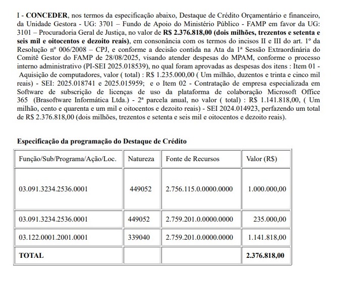 O Ministério Público do Amazonas (MP-AM) aprovou a liberação de R$ 2.376.818,00 em crédito orçamentário, para custear despesas internas. A decisão foi deliberada em reunião extraordinária do Comitê Gestor do Fundo de Apoio ao Ministério Público (Famp), realizada em 28 de agosto de 2025, e oficializada por meio de processo administrativo.