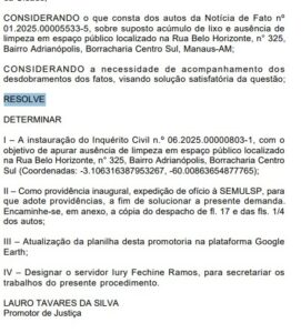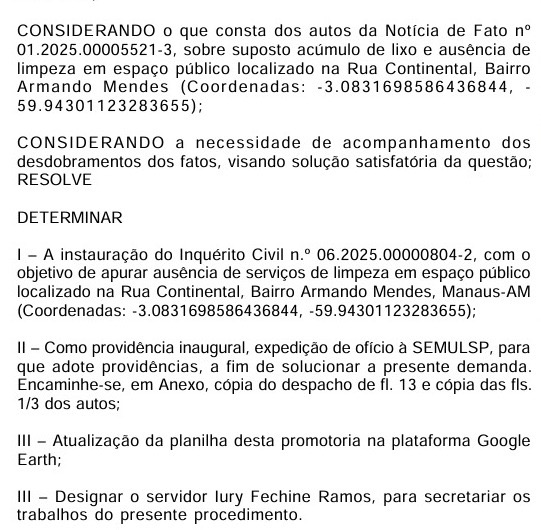 Conforme os despachos assinados pelos promotores de Justiça, os inquéritos foram abertos após denúncias de moradores que relataram o acúmulo de lixo, mato alto e abandono de terrenos públicos. Em um dos casos, referente à rua Continental, no bairro Armando Mendes, o MP-AM cita as coordenadas geográficas do local e determina o acompanhamento da situação por meio de registros na plataforma Google Earth.