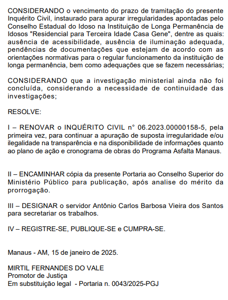O Ministério Público do Amazonas (MP-AM), por meio da 57ª Promotoria de Justiça de Defesa dos Direitos Humanos e Cidadania, renovou inquérito civil para continuar investigado suposta irregularidade e ilegalidade na transparência e na disponibilidade de informações quanto ao plano de ação e cronograma de obras do Programa Asfalta Manaus, lançado no ano de 2022, pelo prefeito David Almeida (Avante). A informação consta no Diário Oficial do MP da quarta-feira (26).