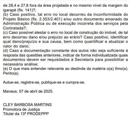 A decisão do MP-AM foi motivada por indícios de erro na construção de um imóvel, que deveria ter sido erguido na cota de 31,5, mas foi edificado entre as cotas de 28,4 e 27,8 fora da área projetada e no mesmo nível da margem do igarapé. A 13ª PRODEPPP (Promotoria de Justiça de Defesa do Patrimônio Público e Improbidade Administrativa) conduzirá o inquérito civil, buscando esclarecer as circunstâncias que levaram à construção do imóvel em local inadequado e apurar eventuais responsabilidades.