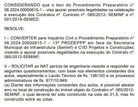 A decisão do MP-AM foi motivada por indícios de erro na construção de um imóvel, que deveria ter sido erguido na cota de 31,5, mas foi edificado entre as cotas de 28,4 e 27,8 fora da área projetada e no mesmo nível da margem do igarapé. A 13ª PRODEPPP (Promotoria de Justiça de Defesa do Patrimônio Público e Improbidade Administrativa) conduzirá o inquérito civil, buscando esclarecer as circunstâncias que levaram à construção do imóvel em local inadequado e apurar eventuais responsabilidades.