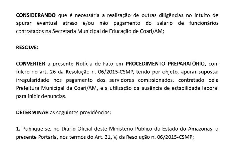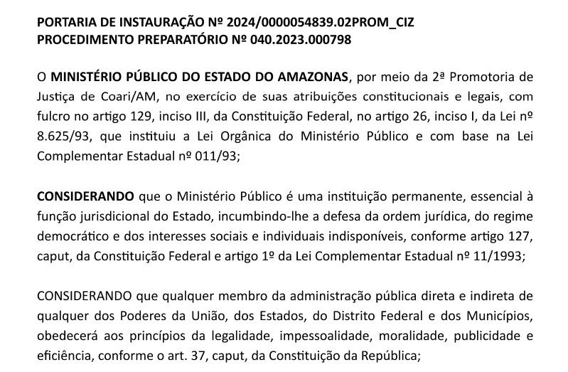 O Ministério Público do Amazonas (MPAM) abriu uma investigação para apurar supostas irregularidades nos pagamentos de servidores comissionados contratados pela Prefeitura de Coari (distante 363 quilômetros de Manaus), sob a gestão de Keitton Pinheiro (PP). A investigação também inclui a análise de denúncias sobre o uso da ausência de estabilidade laboral desses funcionários como forma de inibir queixas e denúncias de irregularidades.
