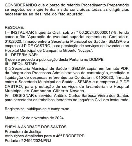 O Ministério Público do Amazonas (MPAM) instaurou inquérito civil para apurar indícios de superfaturamento em um contrato da prefeitura de Manaus, por meio da Secretaria Municipal de Saúde (Semsa), para prestação de serviços de lavanderia em um hospital municipal. A informação consta no Diário Oficial Eletrônico do MPAM da sexta-feira (22).
