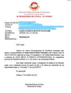 Conforme o processo que tramita no Tribunal de Justiça do Amazonas (TJAM), a manifestação da promotora de justiça Francilene Barroso da Silva foi dada no último dia 7 de outubro, onde descreve: “Este órgão requer a designação de audiência de transação penal, com a intimação pessoal da autora do fato e da vítima por intermédio de sua representante legal”.