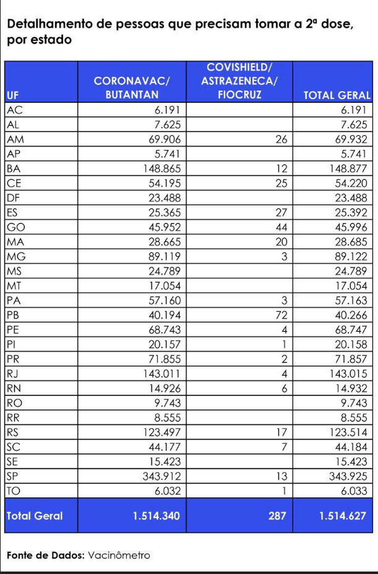 O Ministério da Saúde divulgou ontem (13/04) a lista dos estados com pessoas que estão em atraso para tomar a segunda dose de vacinas contra a covid-19. Hoje, o titular da pasta, Marcelo Queiroga, disse que há 1,5 milhão de brasileiros nessa situação, e alertou que essas pessoas precisam buscar os postos de vacinação.