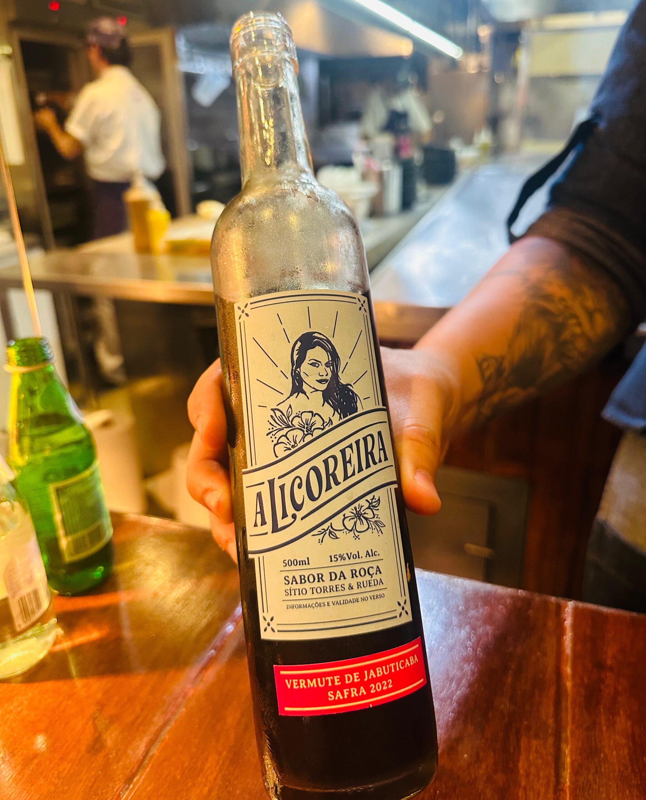 Engana-se quem pensa que finalizou por aí. Logo, o restaurante surpreende apresentando sobremesas incríveis do menu degustação. Começa com sorvete de creme de mamão papaya com crocante de caramelo, servido com licor de Jabuticaba feito pela chef Janaína Rueda, chamado de “A Licoreira” e que também é vendido no local. Para a nossa surpresa, ainda fomos presenteadas com uma garrafa do licor!