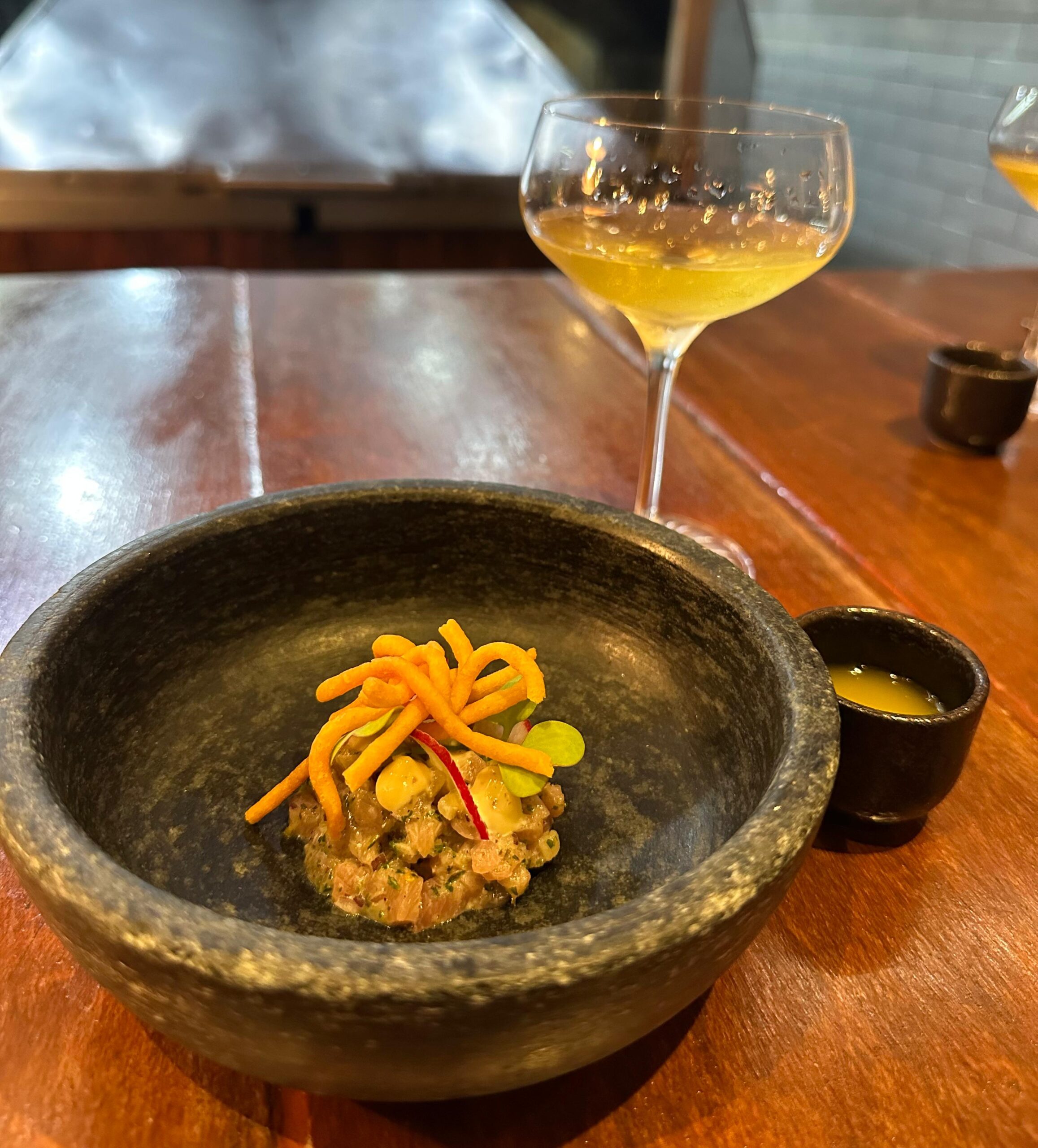 Continuando o menu recebemos o famoso tartare de porco com lombo maturado, servido com rabanete crocante de batata-doce (incrivelmente delicioso). Também acompanha um shot cítrico feito de limão, tangerina, maçã, salsão, gengibre, cebola e menta, que foi sensacional para equilibrar o paladar. Aliás, queria esse shot para beber todos os dias. Confesso kkk