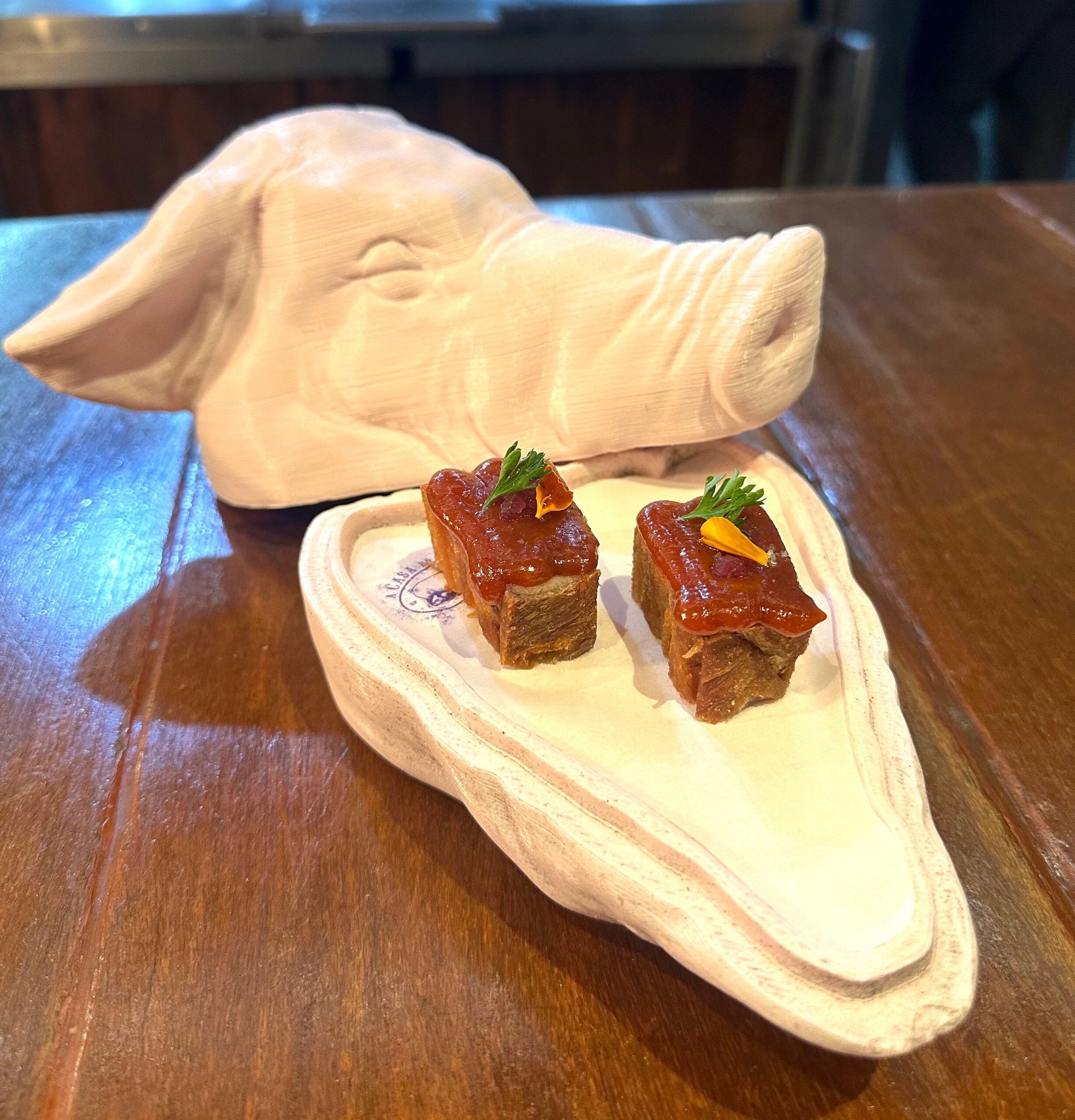 As entradas do menu degustação são Fatias de Copa, Guanciale (bochecha do porco), Lardo e Embutido de Cabeça (servido em um osso de porco), acompanhadas por crocantes de mandioca com porco assado e polenta com fígado de porco. Todos são deliciosos, até o embutido da cabeça que fiquei meio receosa para provar.