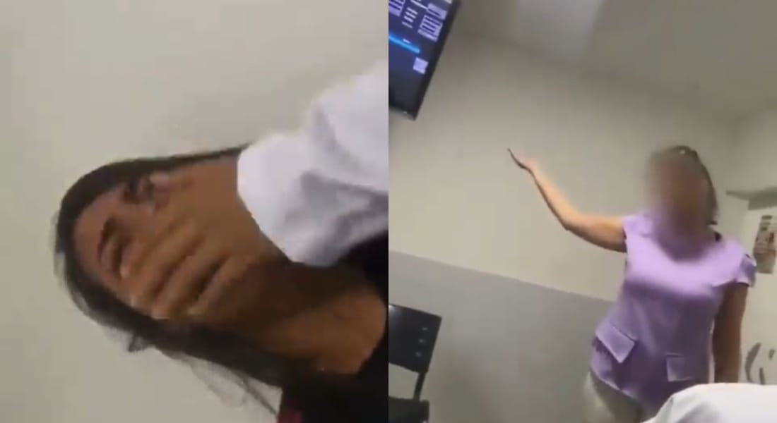 “Saia daqui”, repete a mulher por diversas vezes. Após a vítima se recusar a sair da sala, iniciam-se as agressões.