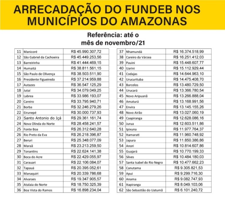 Os municípios de Envira e Novo Aripuanã são as novas cidades a pagarem o Fundeb no Amazonas. Dos 62 municípios do estado, apenas oito divulgaram dados do pagamento, sendo eles Manaus, Iranduba, Autazes, Coari, Anamã, Maués, Anamã, Envira e Novo Aripuanã.