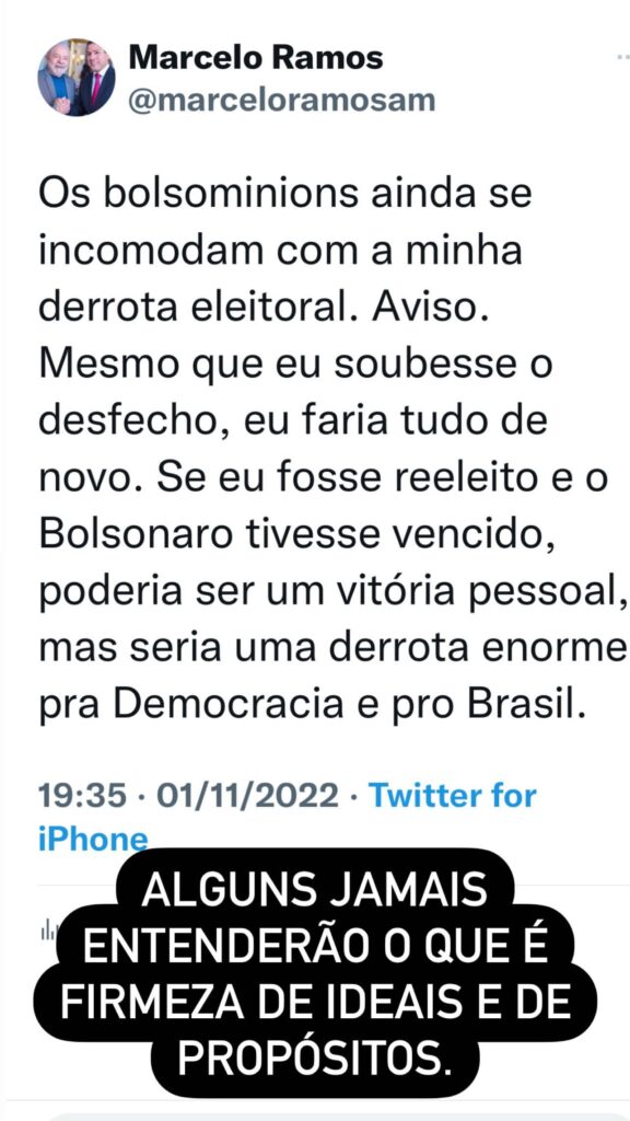 Em seu Instagram, Marcelo Ramos afirma que dedicou seu melhor “para servir ao Brasil e ao Amazonas” e que com a eleição de Luiz Inácio Lula da Silva (PT) à presidência da República, era hora de deixar a vida pública. O futuro ex-deputado disse que pretende se dedicar a projetos que lhe entusiasmem e garantam sua estabilidade. Marcelo terminou o texto agradecendo a todos que confiaram nele ao longo de sua carreira política.