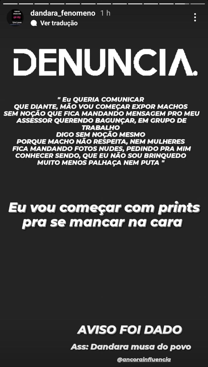 “Eu queria comunicar, de antemão, que vou começar a expor machos sem noção que ficam mandando mensagens para meu assessor querendo bagunçar em grupo de trabalho, digo sem noção mesmo, porque macho que não respeita nem mulheres, fica mandando fotos nudes, pedindo para me conhecer, sendo que eu não sou brinquedo, muito menos palhaça, nem put@. Eu vou começar com prints para se mancar na cara. Aviso foi dado”, desabafou a influencer.