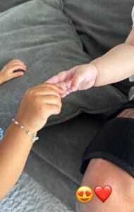 O registro mostra as pequenas de mãos dadas. O jogador aproveitou e colocou um emoji de carinha apaixonada e um coração vermelho na publicação.