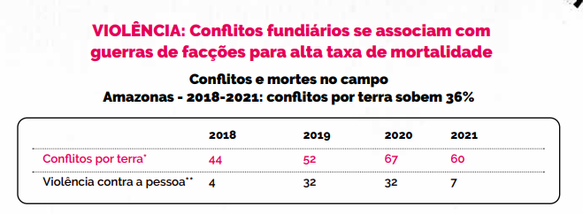 Durante três anos de governo Bolsonaro, 40% dos 5.725 conflitos por terra registrados no Brasil ocorreram na Amazônia Legal, o que equivale a dois registros por dia. Além do Amazonas, a região engloba os estados do Acre, Amapá, Maranhão, Mato Grosso, Rondônia, Pará e Tocantins. No ano de 2021, a Amazônia Legal registrou uma taxa de violência letal nos municípios de 30,9 a cada 100 mil habitantes, com percentual de 38,6% que supera a média nacional.
