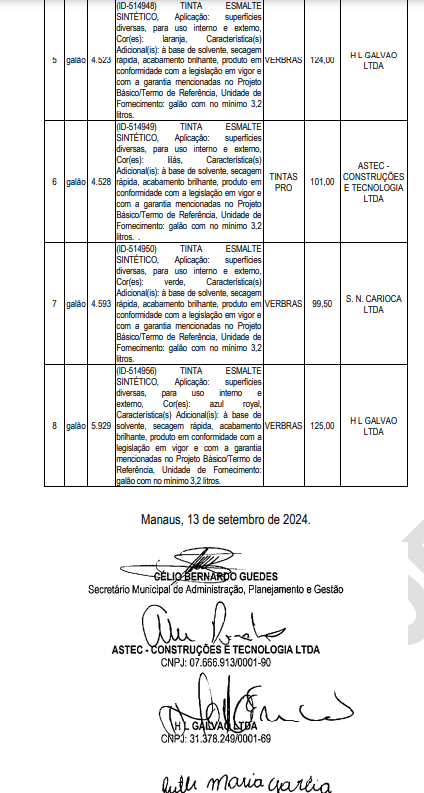 As empresas vencedoras do processo licitatório foram R M Garcia Ltda. (R$ 233 mil), S N Carioca Ltda. (R$ 726,7 mil), Astec Construções e Tecnologia Ltda. (R$912 mil), e H L Galvão Ltda. (R$ 1,9 milhão). Apesar da diversidade de fornecedores, somente duas marcas foram oferecidas pelos fornecedores: Verbras e Tintas Pro. No total, o valor das aquisições pode chegar a R$ 3,7 milhões, somando os gastos com tinta e massa corrida.