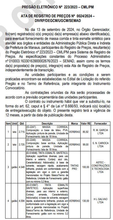 Também foram registrados 5,4 mil latas de massa corrida, que chegam a R$ 503 mil. De acordo com o edital, os produtos serão utilizados principalmente para manutenção e reforma de prédios públicos, incluindo a renovação dos mosaicos coloridos que se tornaram a marca da gestão de David Almeida. O processo faz parte de um Registro de Preços provenientes do Pregão Eletrônico nº 223/2023, com vigência de 12 meses.