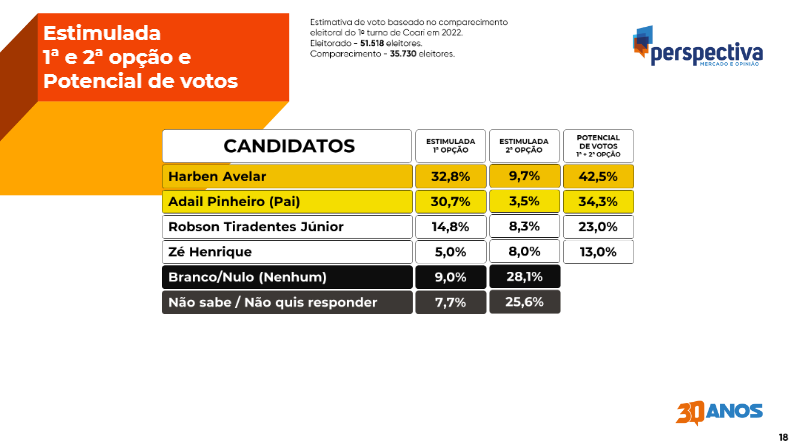 Segundo a pesquisa, Avelar é a primeira opção de voto de 32,8% dos entrevistados. Somando a quem o considera segunda opção, o advogado possui 42,5% de potencial de votos. Adail Pinheiro vem logo em seguida como primeira opção de 30,7% dos entrevistados e segunda opção de 3,5%, totalizando 34,3% de potencial de votos.