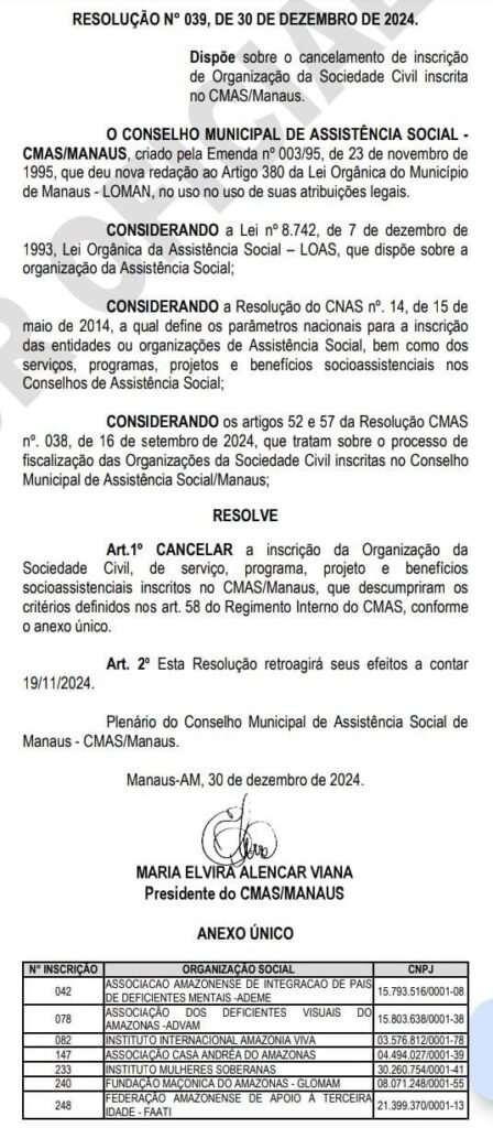 De acordo com a Resolução n° 039, de 30 de dezembro de 2024, assinada pela presidente do CMAS/Manaus, Maria Elvira Alencar Viana, as OSCs tiveram as inscrições canceladas por descumprir um dos critérios definidos pelo Regimento Interno do Conselho Municipal.