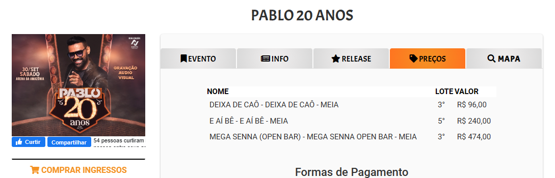Os ingressos estão à venda na internet e fisicamente nas lojas Ótica Veja dos shoppings Manaus Plaza, Manauara, e Grande Circular, bem como na loja Acesso Celular do Sumaúma Park Shopping.