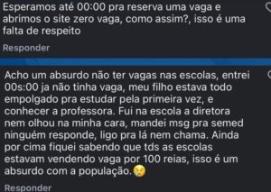 As reclamações surgiram de diferentes zonas da capital amazonense, ressaltando um problema sério e generalizado. As dificuldades atingiram também famílias com prioridade no calendário, como responsáveis por alunos com deficiência (PCDs), que relataram a indisponibilidade imediata de vagas. Em um dos comentários, um responsável relata uma suposta venda de vagas na instituição pública, classificando como um absurdo.