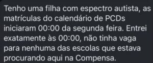 Uma das principais queixas envolve uma responsável por uma criança com Transtorno do Espectro Autista (TEA). Segundo ela, as matrículas para o público PcD começaram à meia-noite da última segunda-feira, 12, mas, ao acessar o sistema exatamente nesse horário, não havia vagas disponíveis em nenhuma escola da Compensa.
