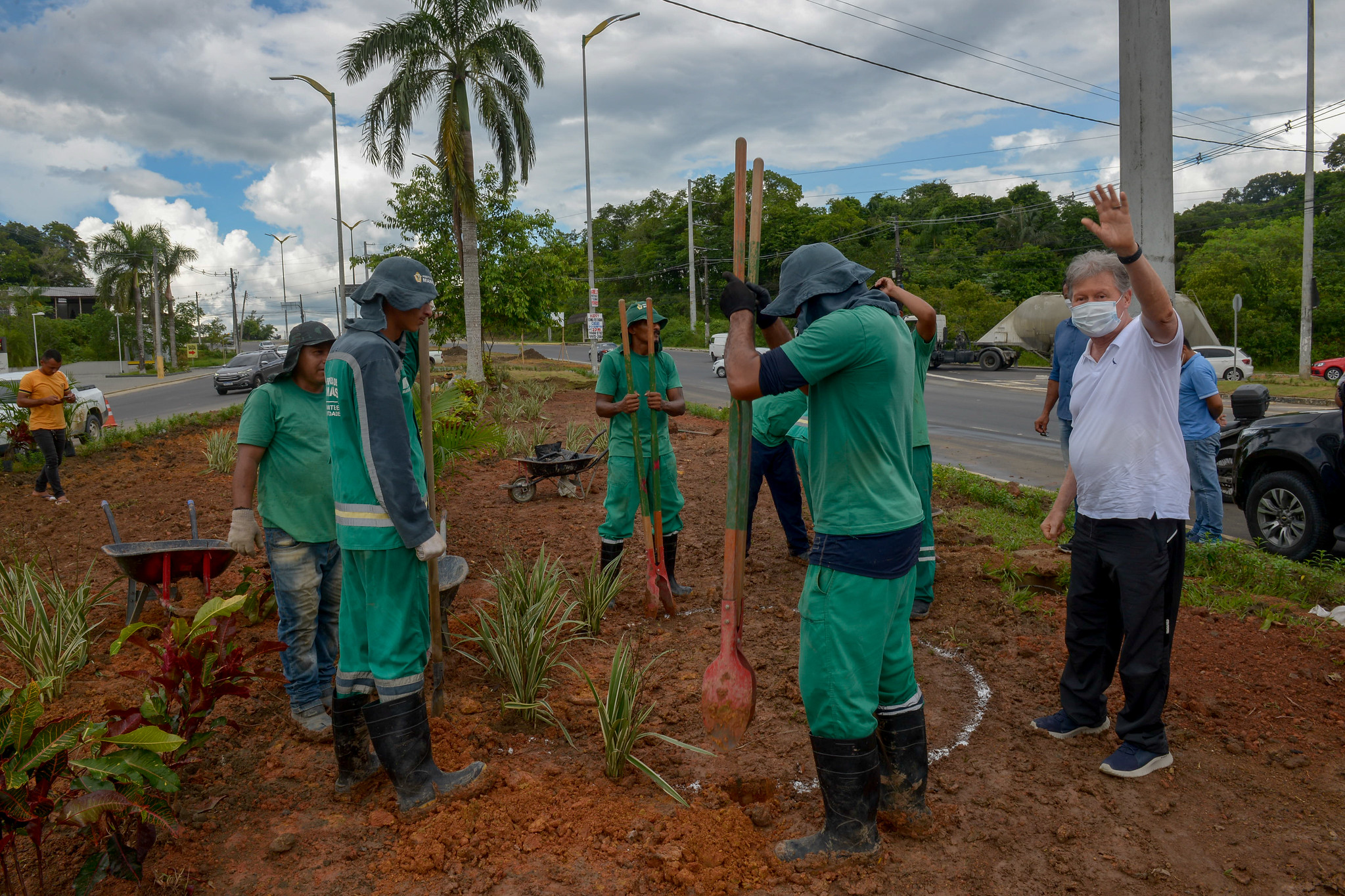O plantio de mudas ornamentais em canteiros, rotatórias e espaços públicos avança pela cidade. Nesta segunda-feira, 23/11, o prefeito de Manaus, Arthur Virgílio Neto, vistoriou o trabalho de paisagismo realizado na avenida do Turismo, zona Oeste, e destacou que essas intervenções contribuem na luta contra o aquecimento global. As ações, coordenadas pela Comissão Especial de Paisagismo e Urbanismo, presidida pela primeira-dama Elisabeth Valeiko Ribeiro, estão com ao menos seis frentes simultâneas em várias zonas.