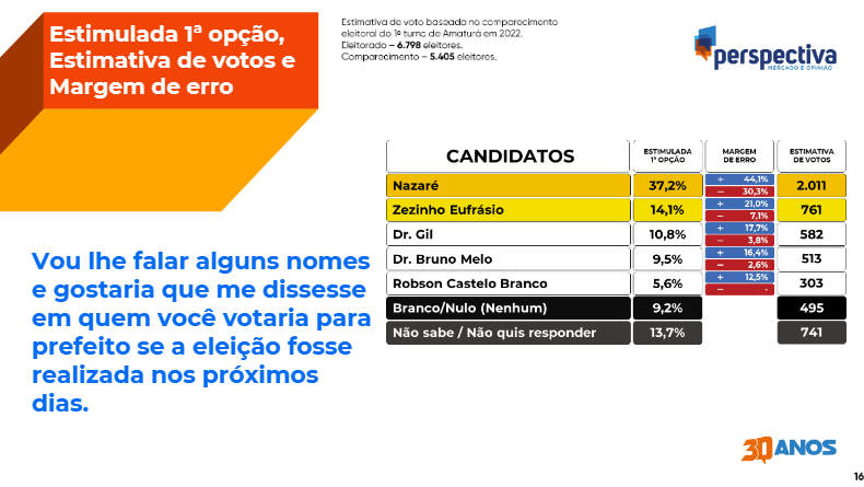 A ex-secretária municipal de Saúde de Amaturá, Nazaré Rocha (MDB), lidera o levantamento divulgado pelo instituto Perspectiva Mercado e Opinião para a prefeitura da cidade. Candidata a vice-prefeita em 2020 na chapa de Dr. Bruno (Podemos), Nazaré figura na primeira colocação com 37,2% da preferência, à frente do prefeito Zezinho Eufrásio (Solidariedade), com 14,1%. A pesquisa aferiu que o atual gestor é desaprovado por 61,7% dos moradores de Amaturá.