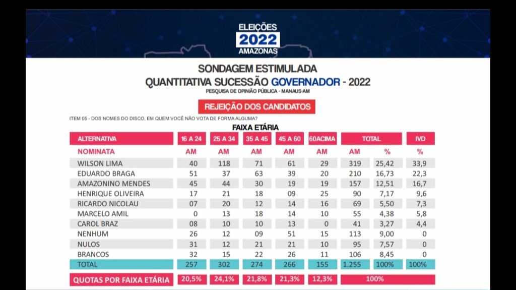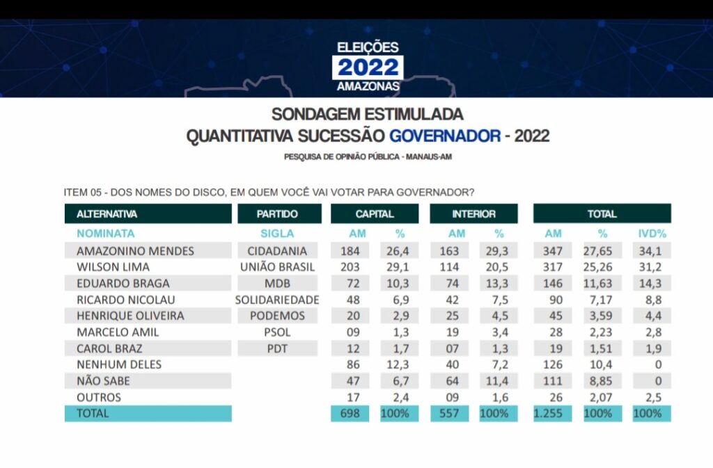 Uma pesquisa realizada entre os dias 1° e 4° de Julho, no municípios polo do Amazonas e na capital, mostram que foram ouvidos 1.255 eleitores com faixa etária entre 16 e 60 anos. A margem de erro da pesquisa é de 3 pontos percentuais para mais ou para menos. A pesquisa de número 04178/2022 foi registrada no Tribunal Regional Eleitoral do Amazonas (TRE-AM).