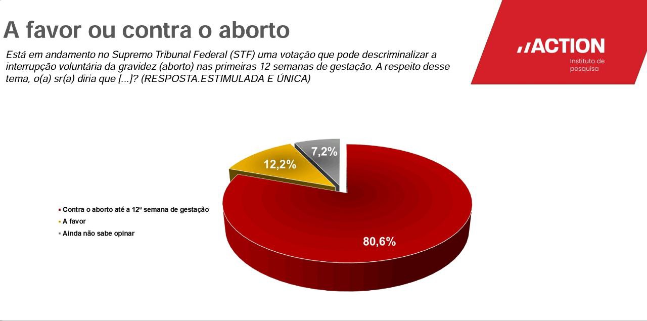 Na pesquisa, 80,6% afirmaram ser contra o aborto, 12,2% a favor do aborto voluntário até a 12ª semana de gestação, e 7,2% não souberam opinar.