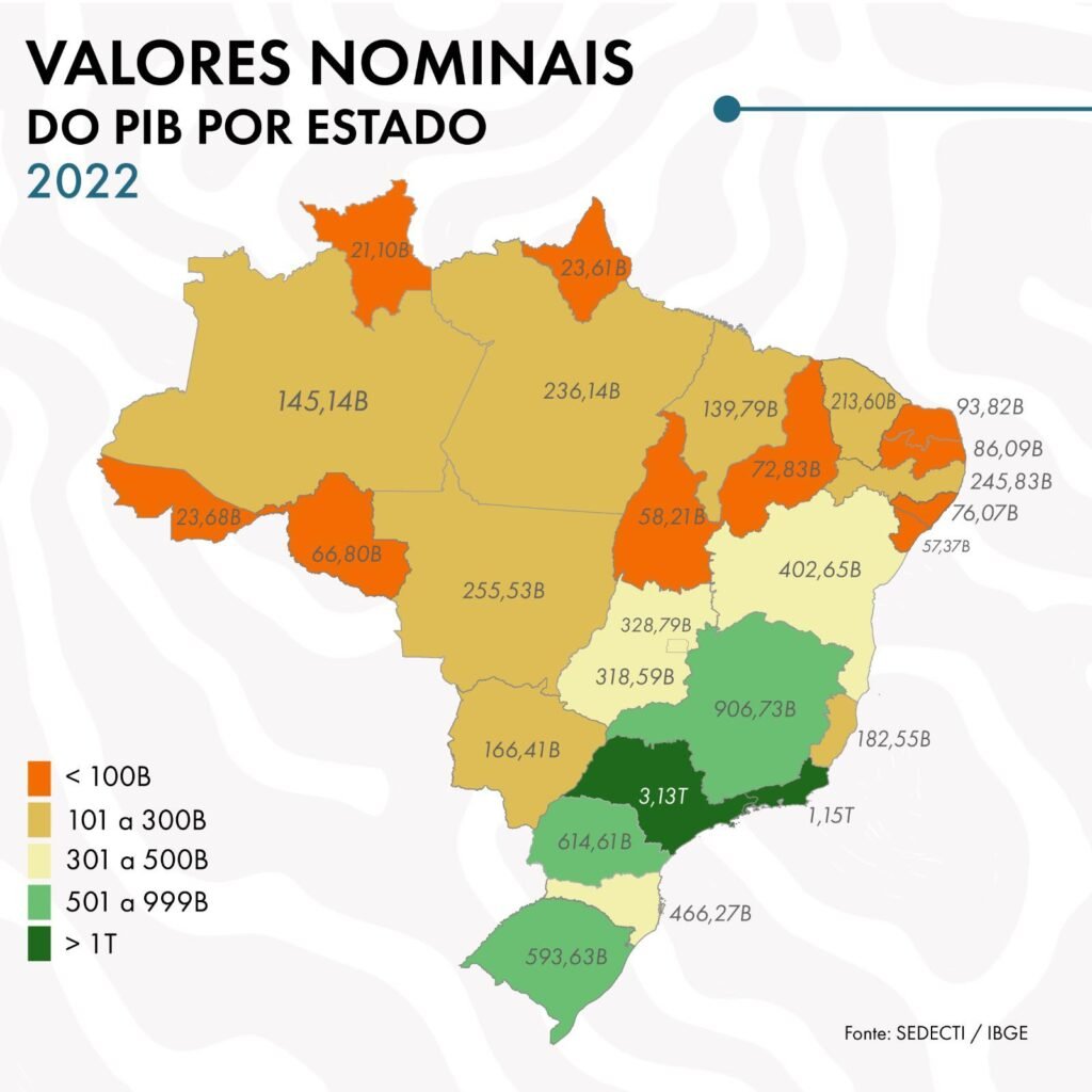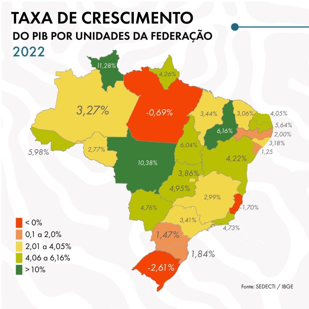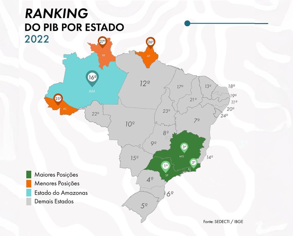 O Amazonas manteve-se em 16º lugar no ranking nacional do PIB em 2022, enquanto São Paulo liderou com R$ 3,13 trilhões, seguido por Rio de Janeiro e Minas Gerais. Diversos estados, entretanto, enfrentaram retrações na economia, como Pará (-0,69%) e Espírito Santo (-1,7%). Esse cenário reforça a importância de políticas regionais específicas para o desenvolvimento sustentável e a competitividade das economias locais.
