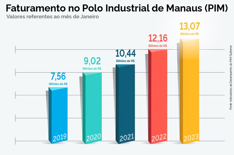 No mês de janeiro de 2023, o Polo Industrial de Manaus (PIM) alcançou faturamento de R$ 13,07 bilhões, iniciando o ano com valor recorde para o mês. O resultado é 7,47% superior ao atingido em janeiro do ano passado (R$ 12,16 bilhões). Em dólar, o faturamento do PIM no primeiro mês de 2023 foi de US$ 2.56 bilhões, apresentando crescimento de 12,91% em comparação a janeiro de 2022.