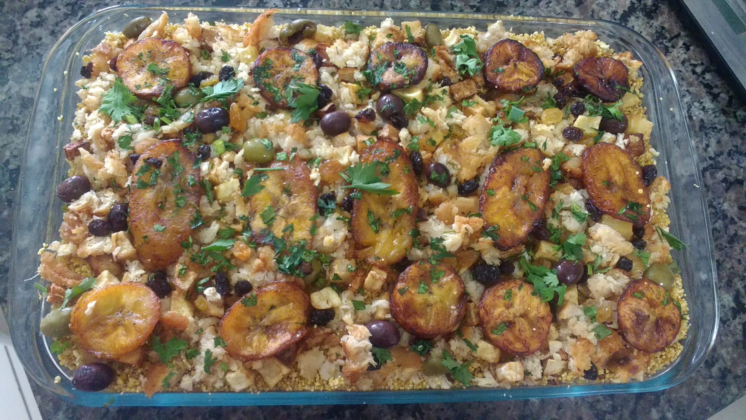 Organize em camadas alternadas, dando uma leve amassada com as mãos “para vestir bem”. Na última pode usar os pedaços maiores de peixe e batatas, azeitonas, bananas em rodelas e uvas passas.