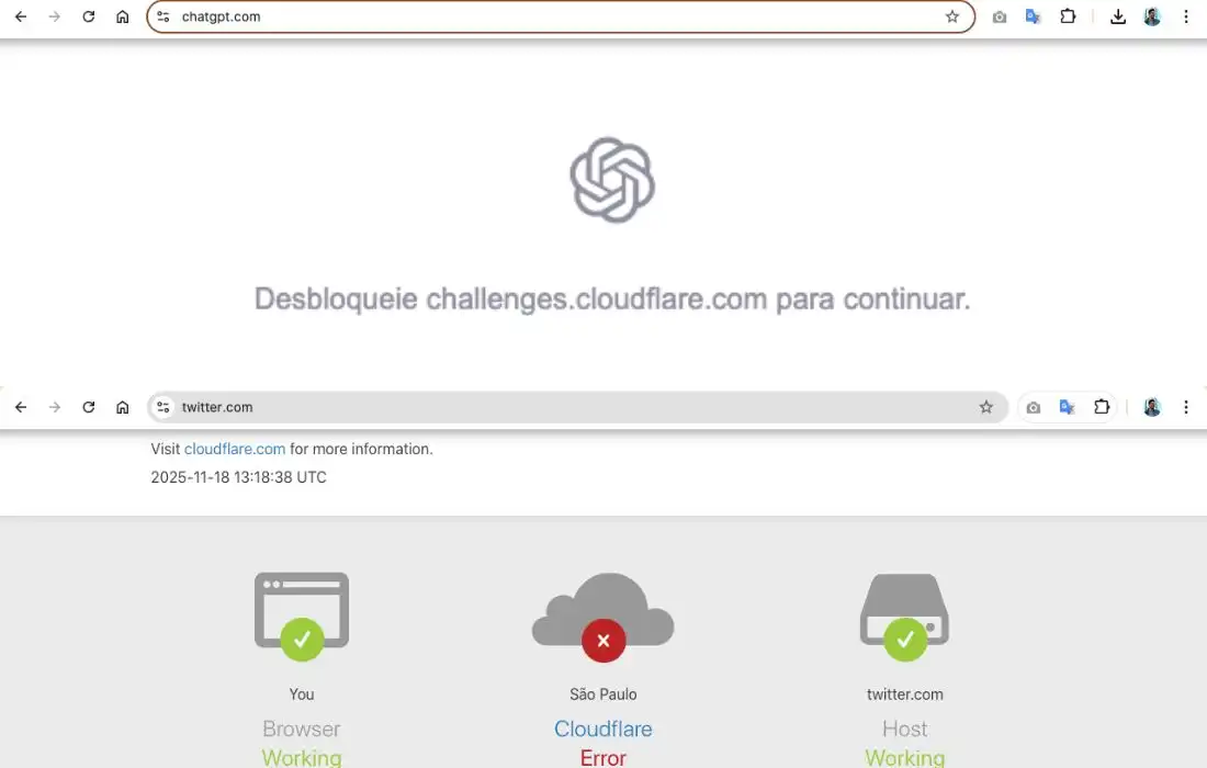 Uma instabilidade global acontece na manhã desta terça-feira (18) em meio a problemas no serviço de distribuição de conteúdo em nuvem da Cloudflare. Aplicativos e sites como X (antigo Twitter), ChatGPT e Canva foram afetados.