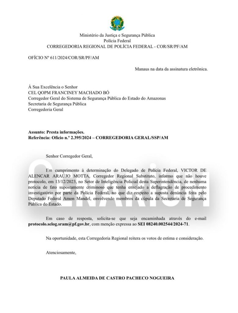 O documento da PF foi enviado a pedido do corregedor regional da instituição, o delegado Victor de Alencar Araújo Motta, ao corregedor geral do Sistema de Segurança Pública do Amazonas, coronel Franciney Machado Bó. O ofício confirma que não há procedimento investigatório aberto a partir de “suposta denúncia feita pelo Deputado Federal Amon Mandel, envolvendo membros da cúpula da Secretaria de Segurança Pública“.