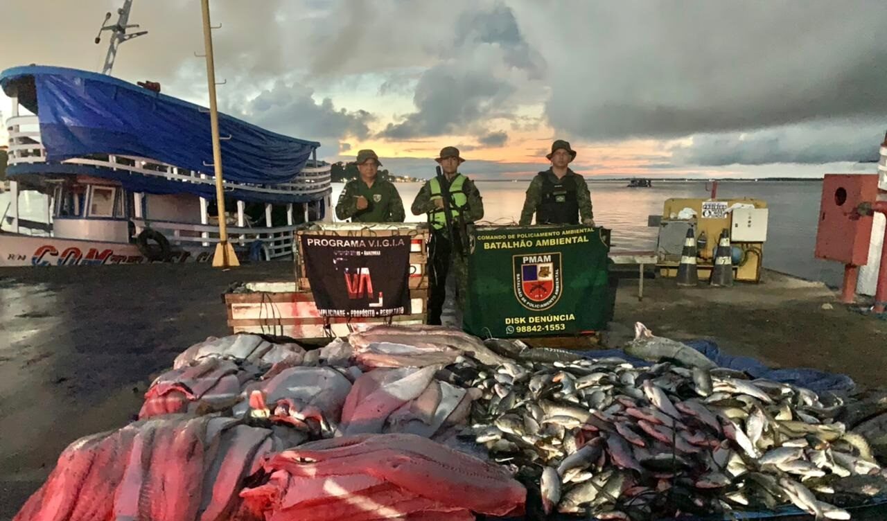 As equipes realizaram a abordagem e fiscalização de uma embarcação, oriunda do município de Codajás, e encontraram duas toneladas de pescado ilegal, pirarucu e outras espécies de peixes, acondicionados em várias caixas de isopor, que seriam entregues em Manaus.